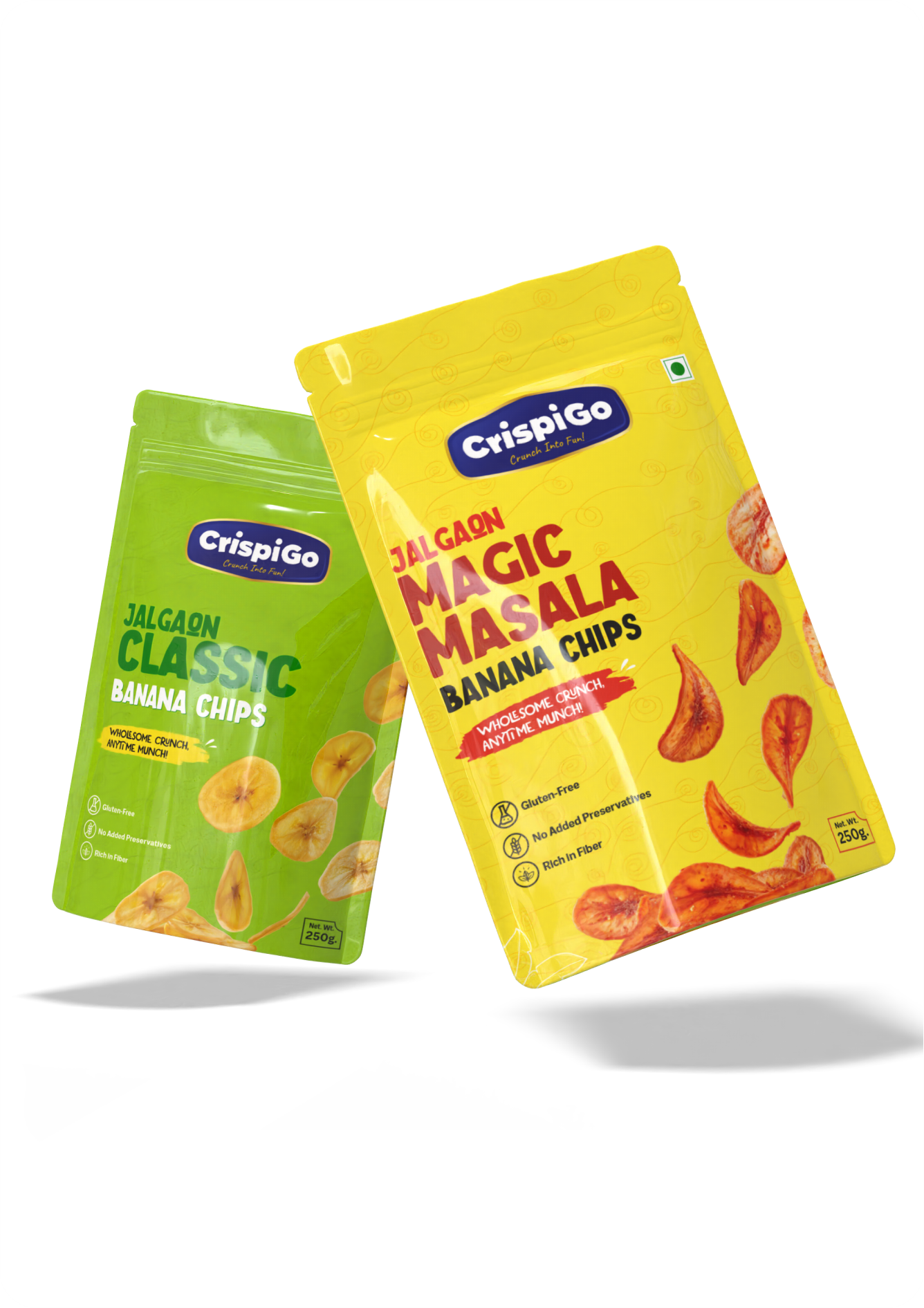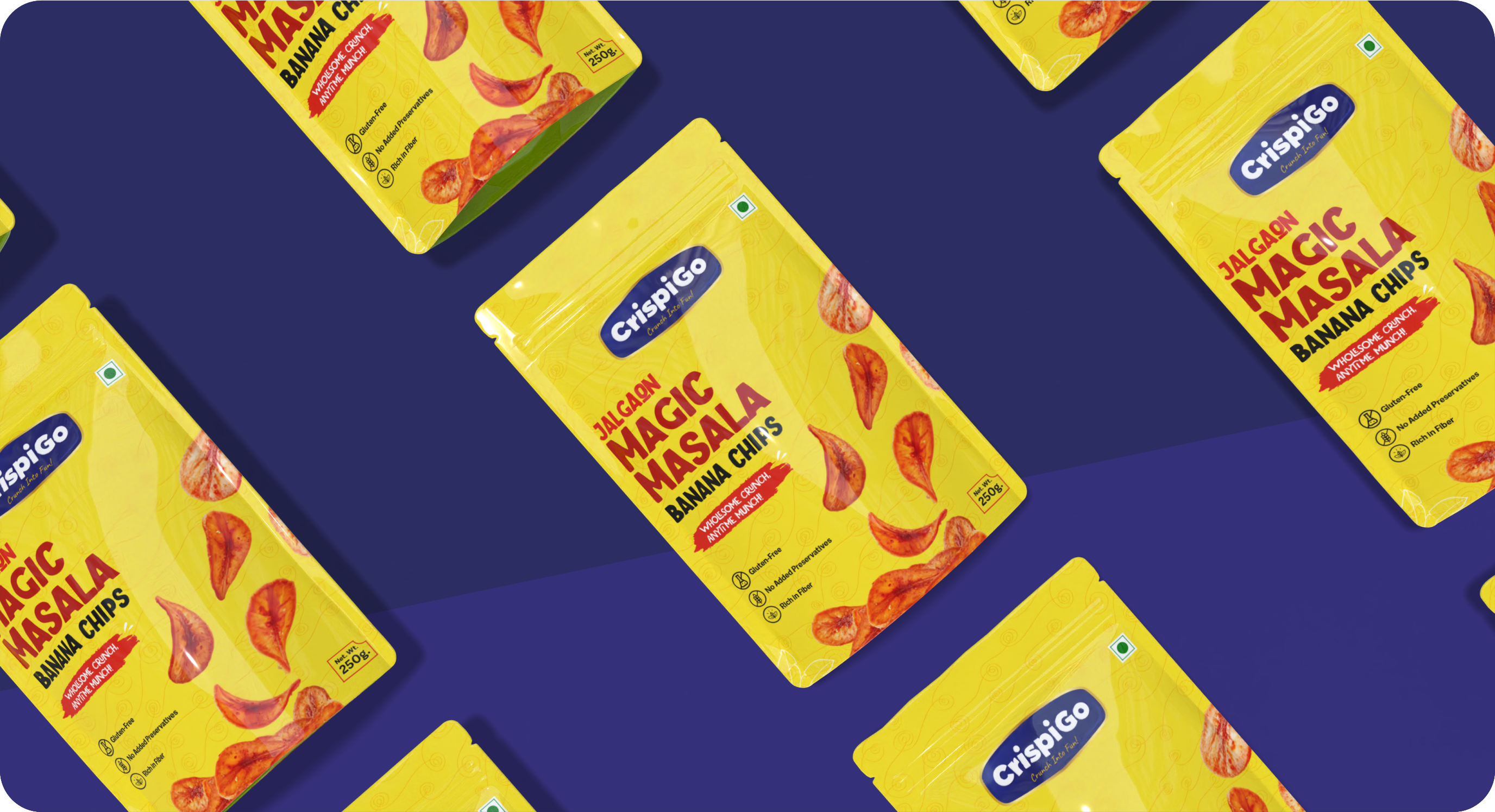 Crispigo, a snack brand focused on banana chips, wanted a complete brand identity design and custom packaging design that would attract customers in a competitive FMCG market.